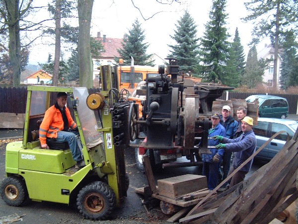 Einen „gewichtigen Umzug“ hatte der Arbeitskreis Historisches Handwerk in Tirschenreuth zu erledigen. Das gesamte Inventar der Fassbinderei Mickisch musste in eine andere Halle verfrachtet werden. Die bisherige Lagerstätte bei der Familie Bayreuther wird für eigene Bedürfnisse benötigt. So rückten am 20. Oktober 2003 ein Stapler und mehrere Transportfahrzeuge an, um den Transport in eine Holzhalle beim der ehemaligen Hammgelände durch zu führen. Mehrere freiwillige Helfer waren den ganzen Tag beschäftigt, um die Kleinteile zu stapeln und tonnenschwere Maschinen mit Hilfe eines Staplers zu verladen. Diese neue Lagerstätte ist auch nur eine Notlösung. Der Arbeitskreis ist nach wie vor bestrebt, einen geeigneten Raum zu finden, um die Fassproduktion der Öffentlichkeit präsentieren zu können. In der Tirschenreuther Fassbinderfamilie Mickisch wurden nahezu 100 Jahre lang die begehrten Holzfässer hergestellt. Dieser Berufszweig soll damit der Nachwelt bewahrt werden. Derzeit ist der Arbeitskreis Hist. Handwerk am Sammeln weiterer Gegenstände aussterbender Handwerkstradition. In der derzeit schwierigen finanzielle Lage der Kommunen heißt es durchhalten, in der Hoffnung, dass doch einmal wieder bessere Zeiten kommen. |